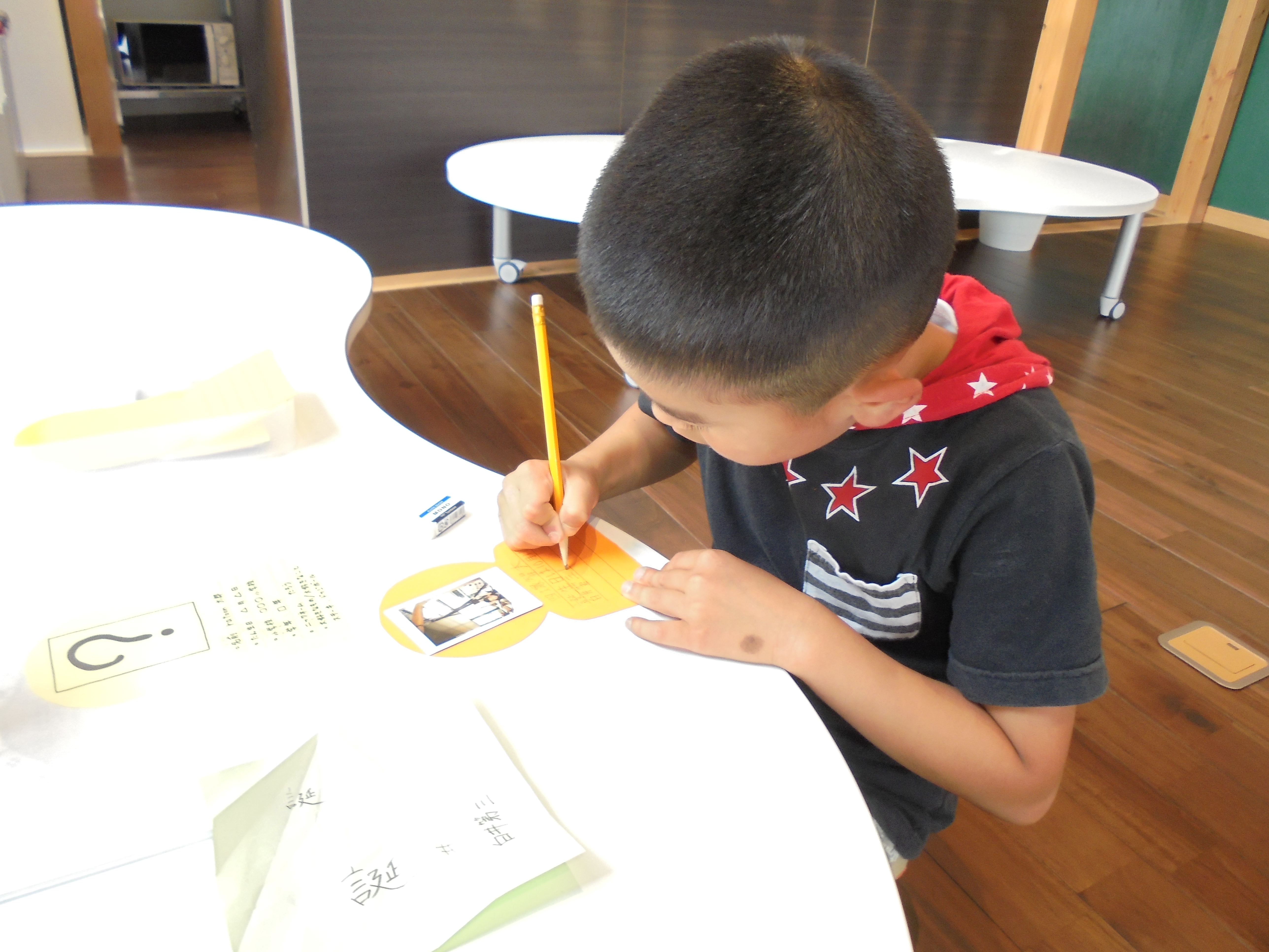 自分の名前や好きなことを書いて、同じ曜日以外の友達にも自己紹介をします。