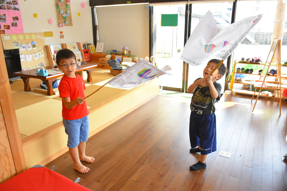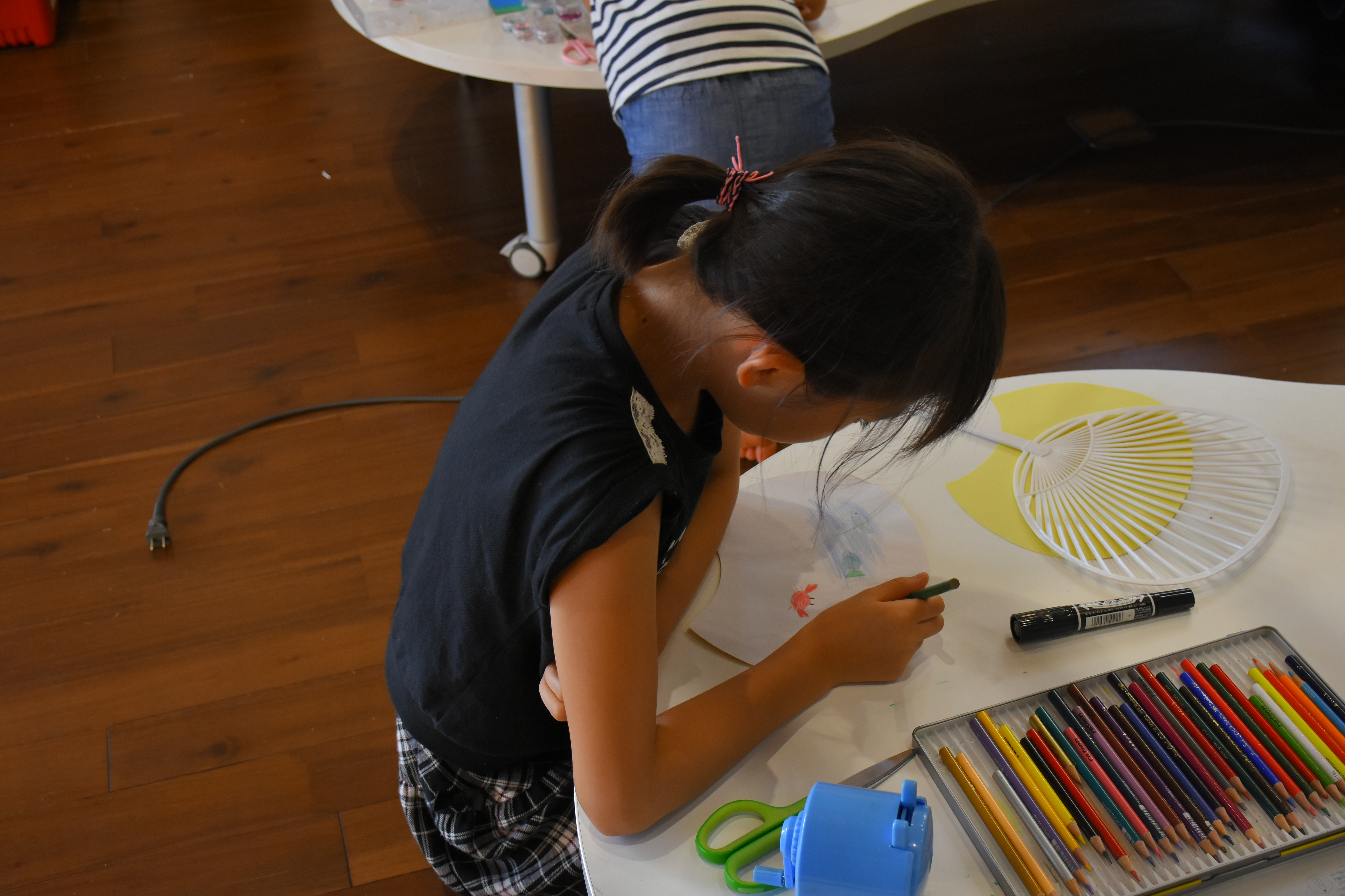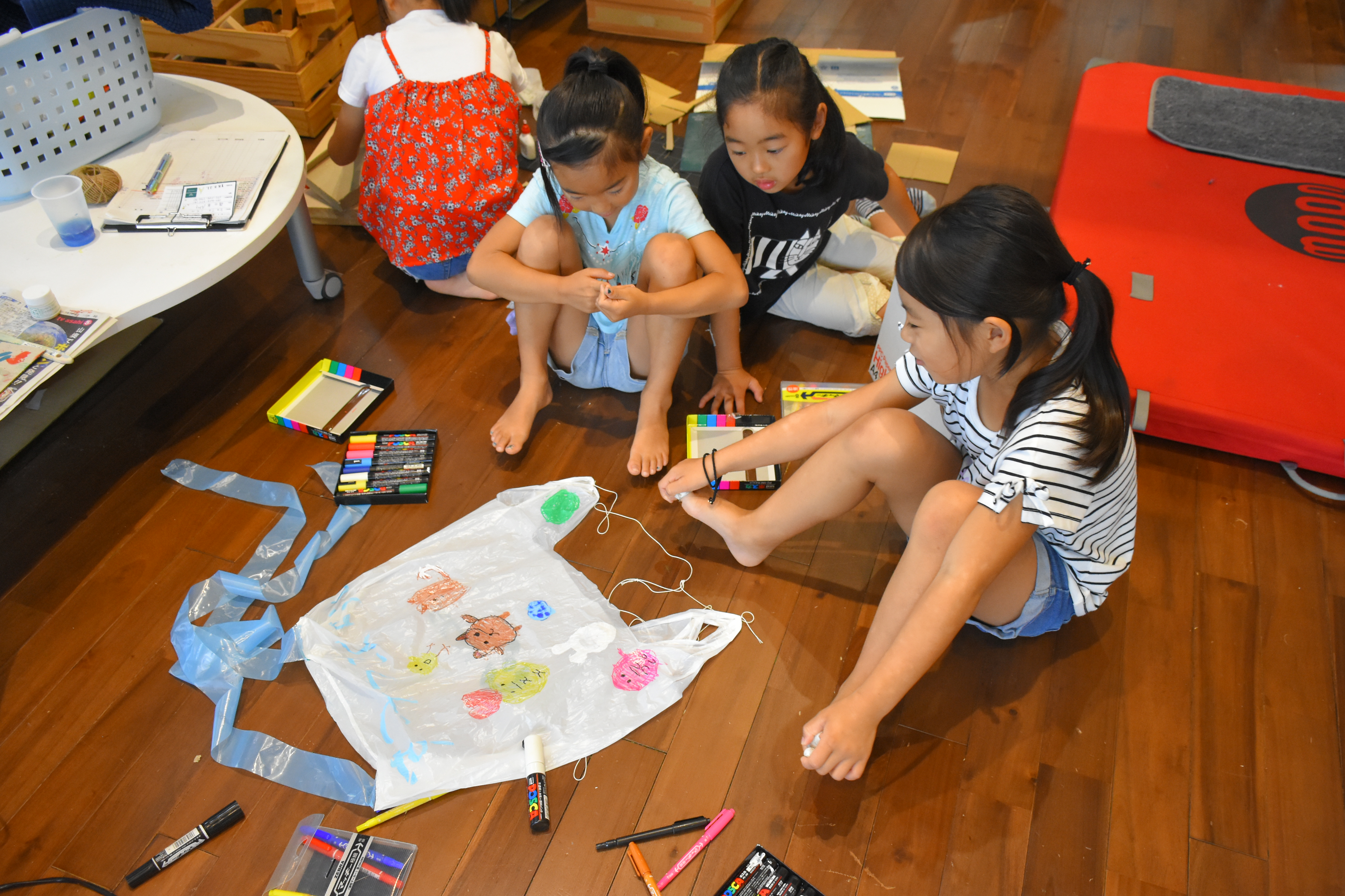プールに入ったり、虫を探しに行ったり、うちわづくりや、虫よけづくり、キャンプに使う旗や、キャンドル、