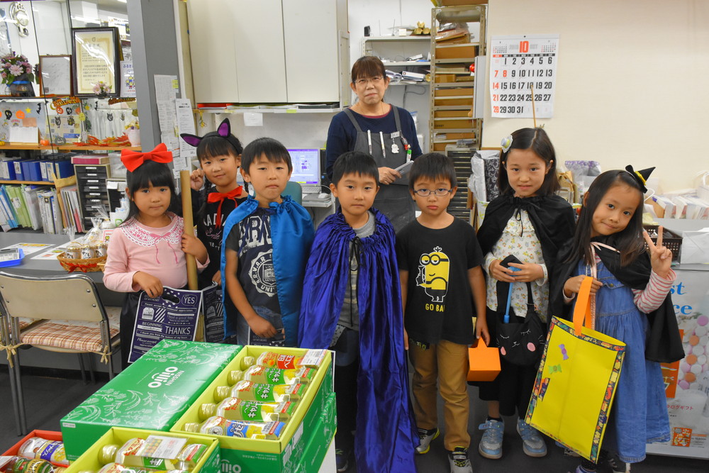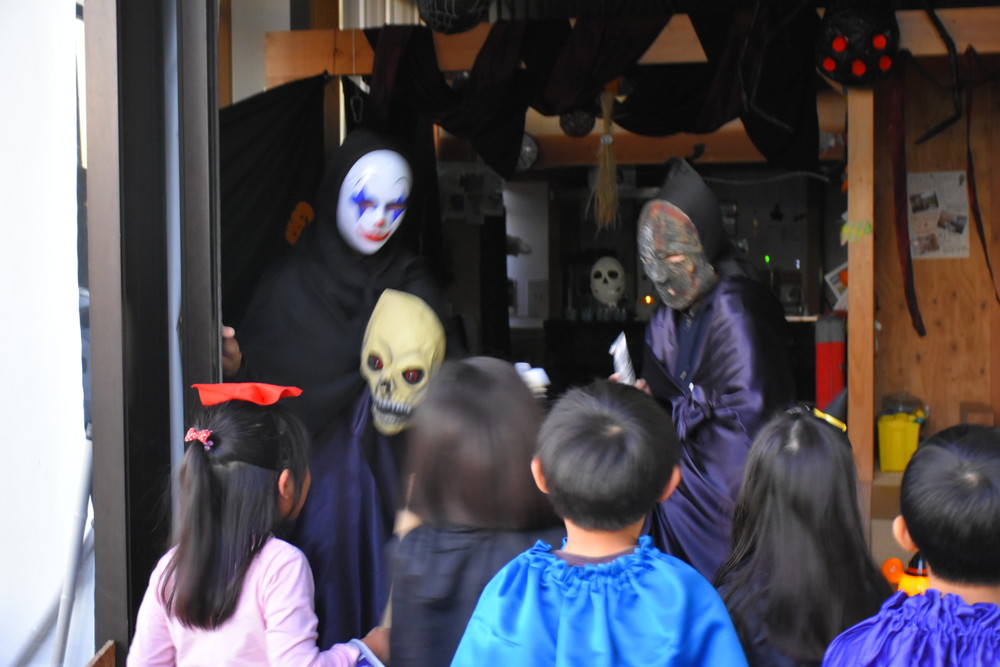 ハロウィンウィーク中は、幼稚園や近くのお店に「トリック オア トリート!」の掛け声とともに、