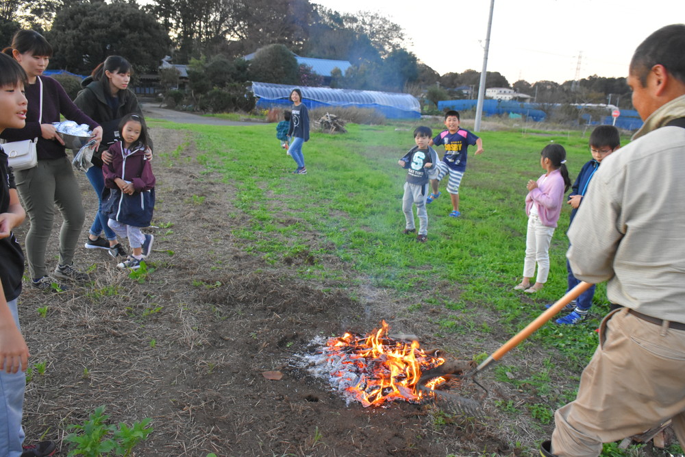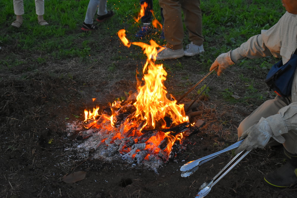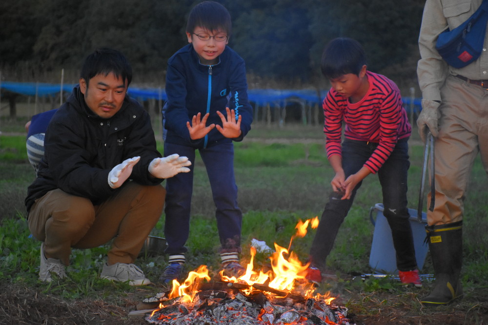 広い畑は夕暮れになると風も冷たく、たき火の暖かさが心地よかったです。