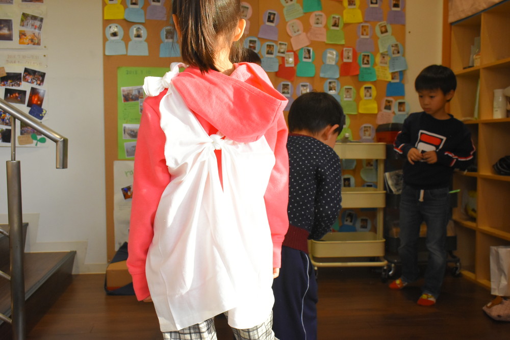 リボンや絵を描いたりして、お店屋さんのエプロンになりました!![]()