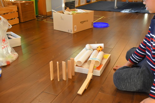 こちらは空き箱やラップの芯を使ってピタゴラ装置を作りました。![]()