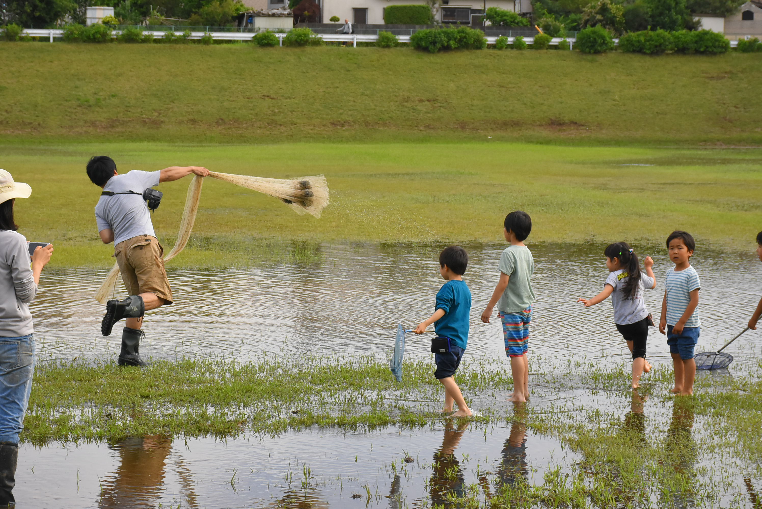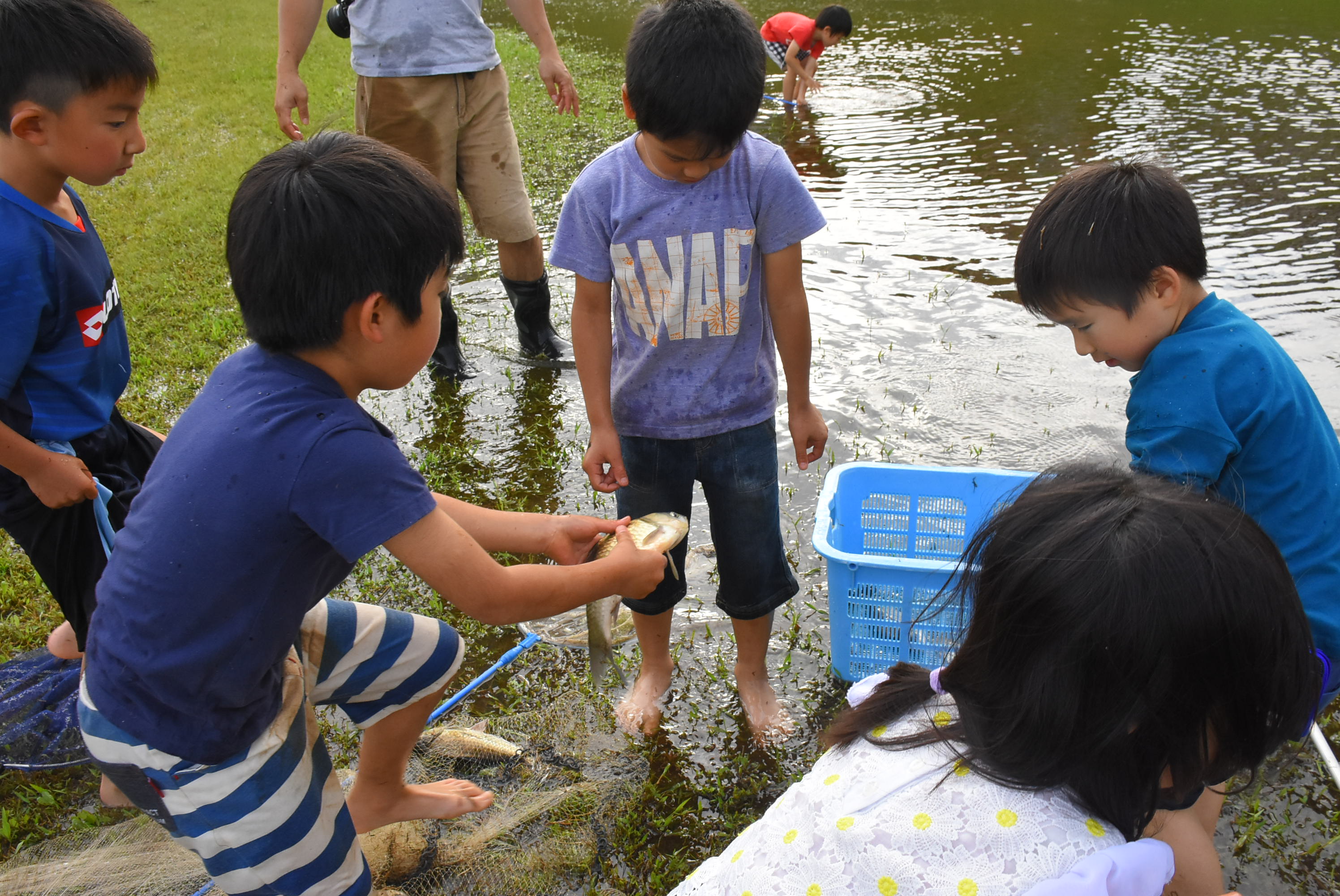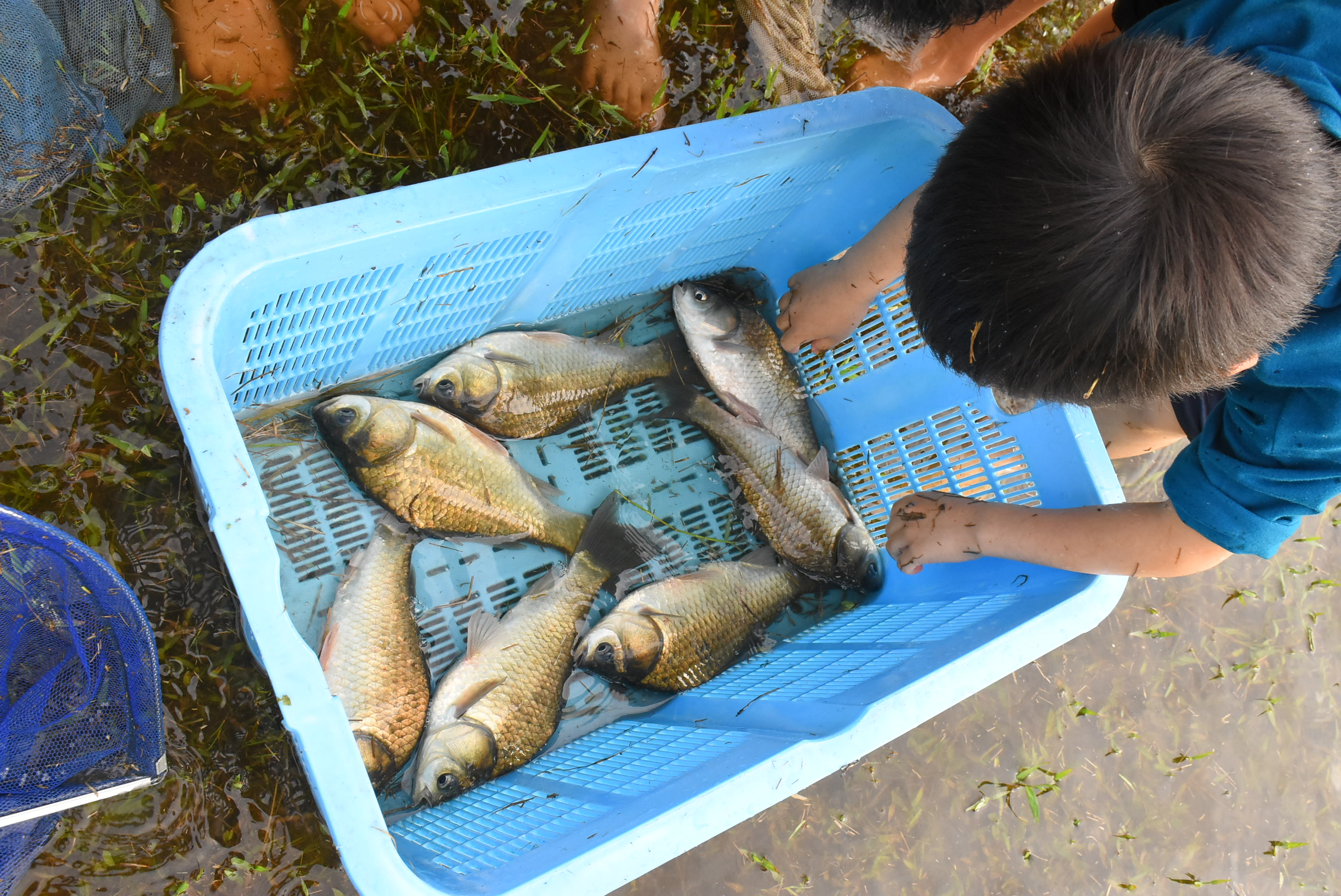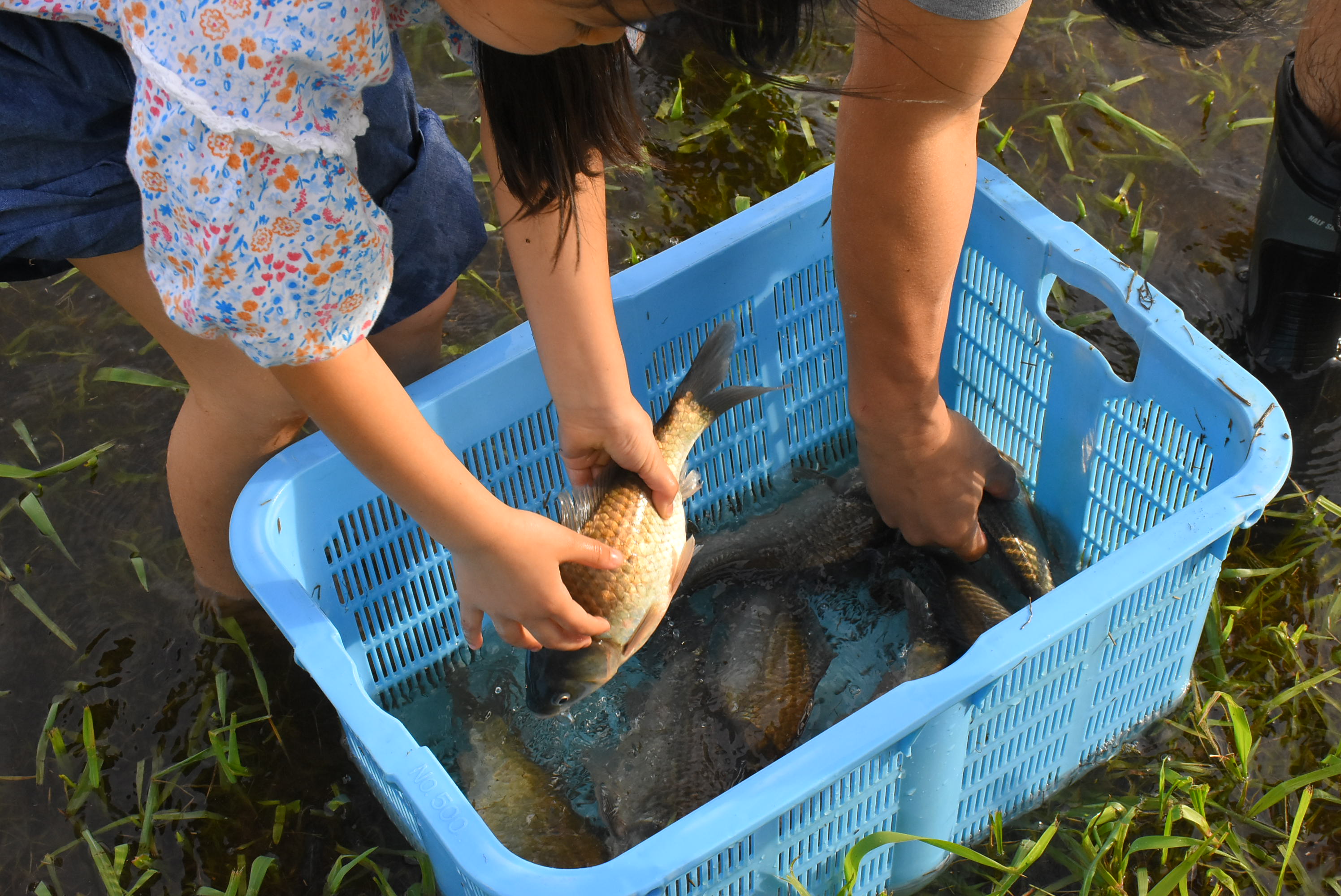 網などを使って追い込んだり、投網にかかった魚をかごに入れたりと、子供達が一生懸命魚を集めて池に戻してくれました。