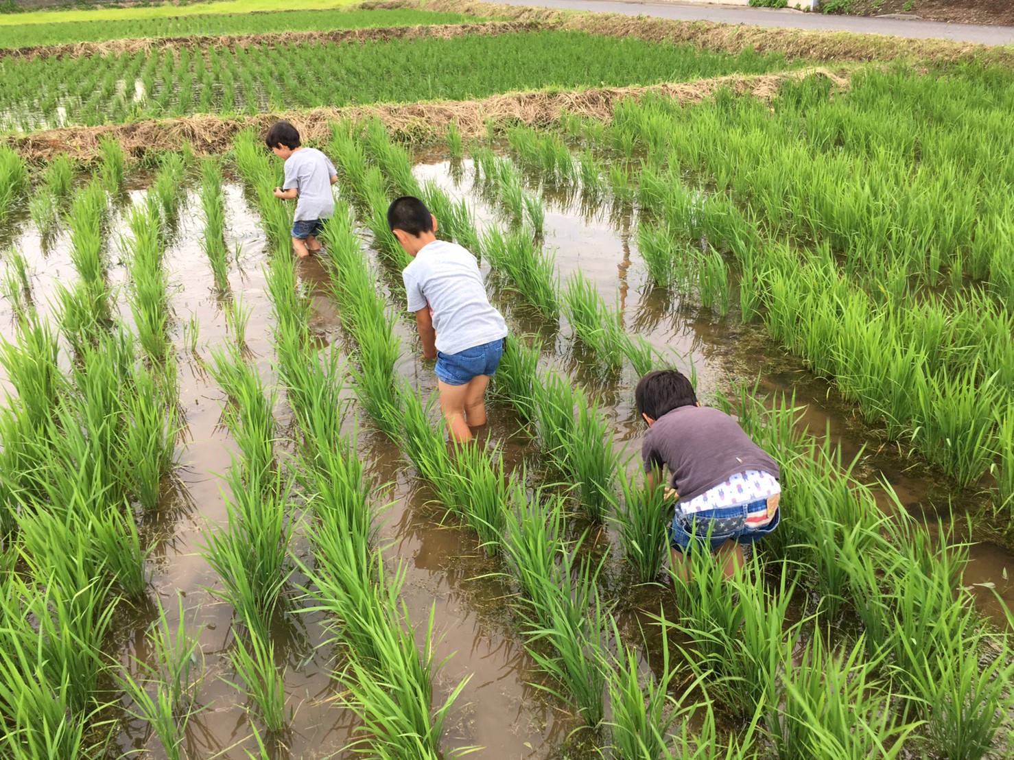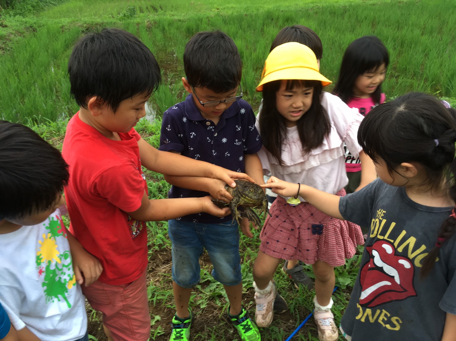 ratoonの子供たちは雨の合間をぬって、田んぼや公園に出かけています。稲も大きく育ってきました!みんなで虫探しをしていると、今日は大物が!(かえるが苦手な方はご注意ください。)