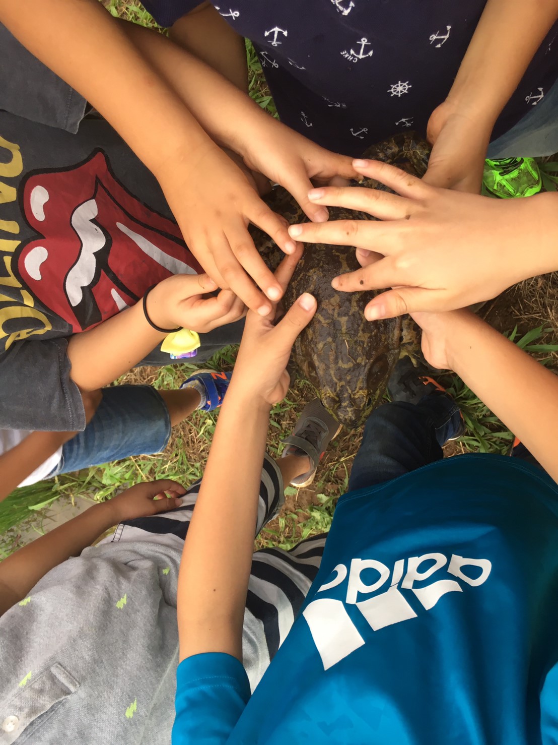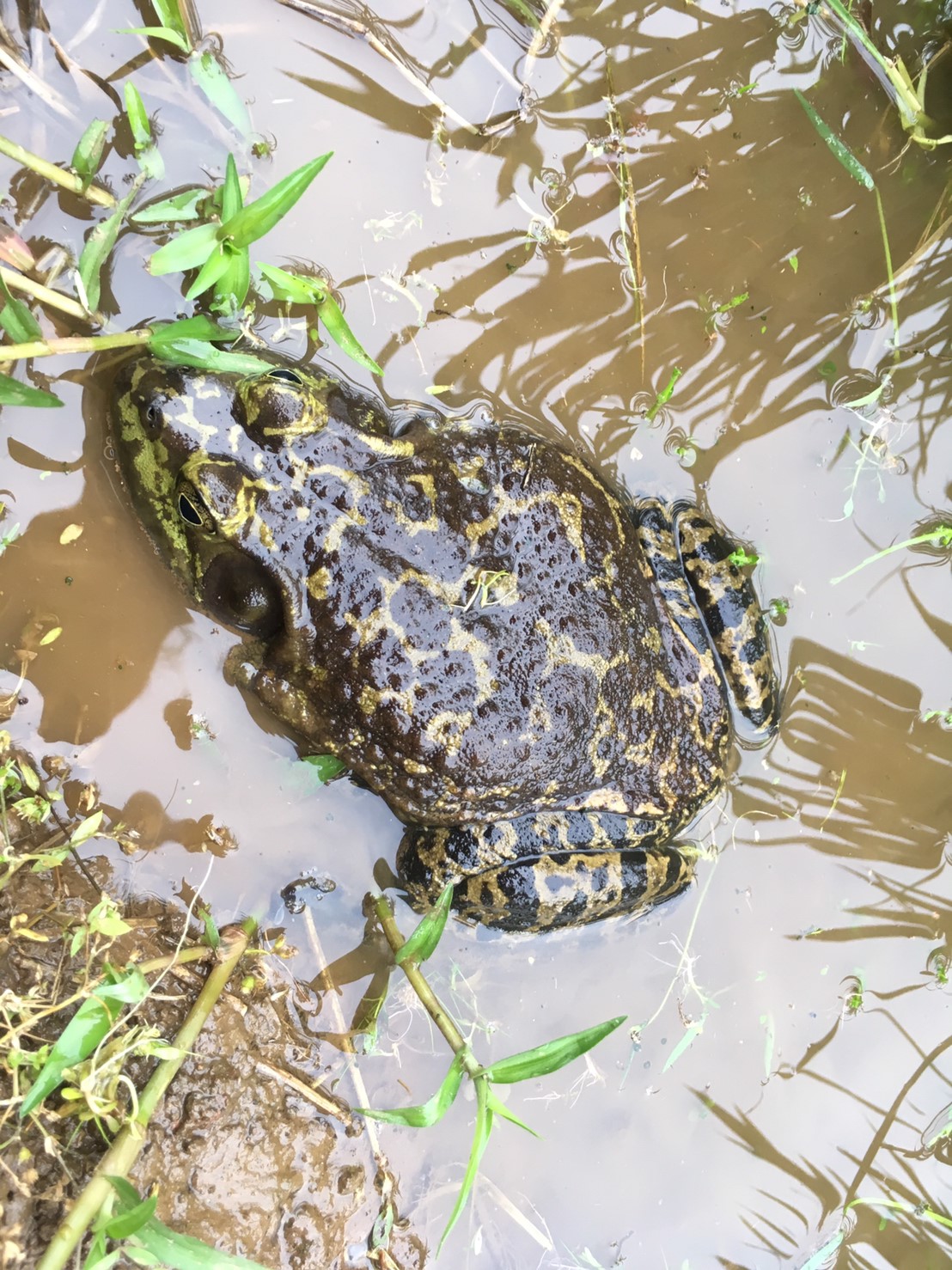 ratoon田んぼでウシガエルを発見!みんな興味津々です。