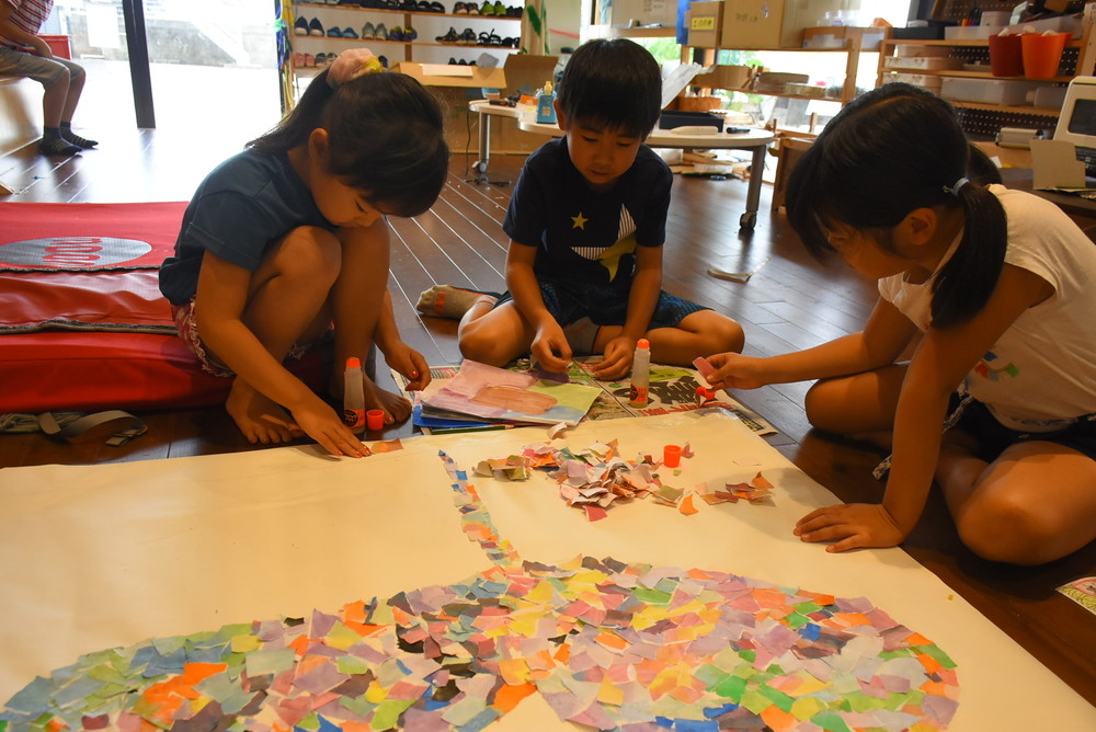 絵具でカラフルに塗った紙を小さくちぎって、貼り付けていきました。