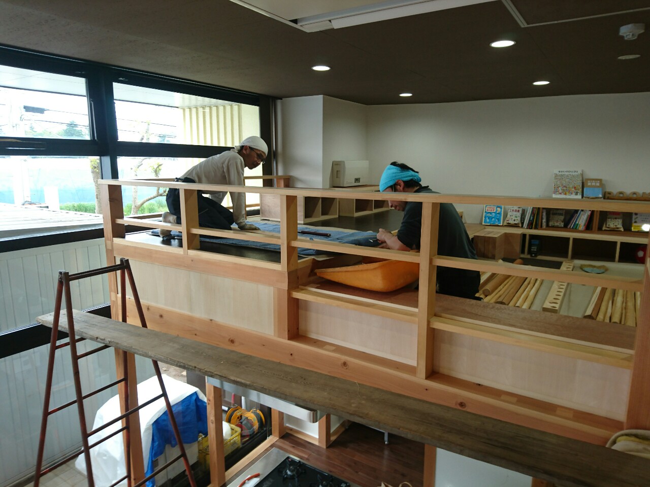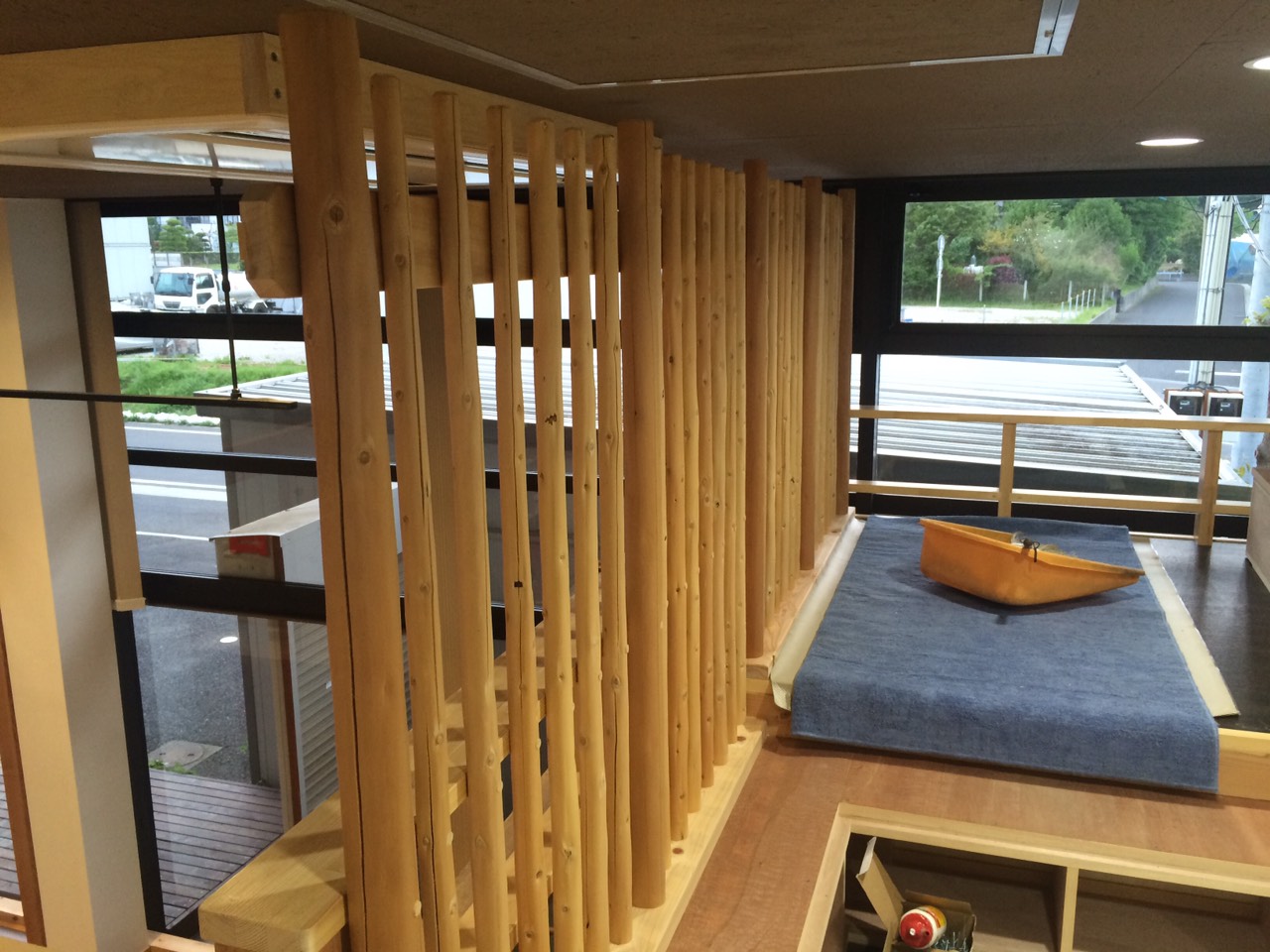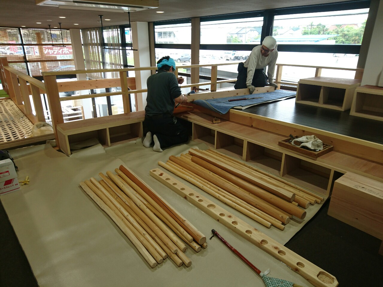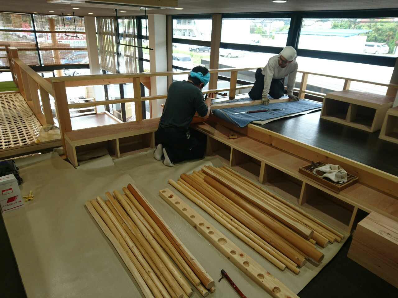お茶室にも使われる素材をつかって施設二階の柵を組み上げてくださいました。