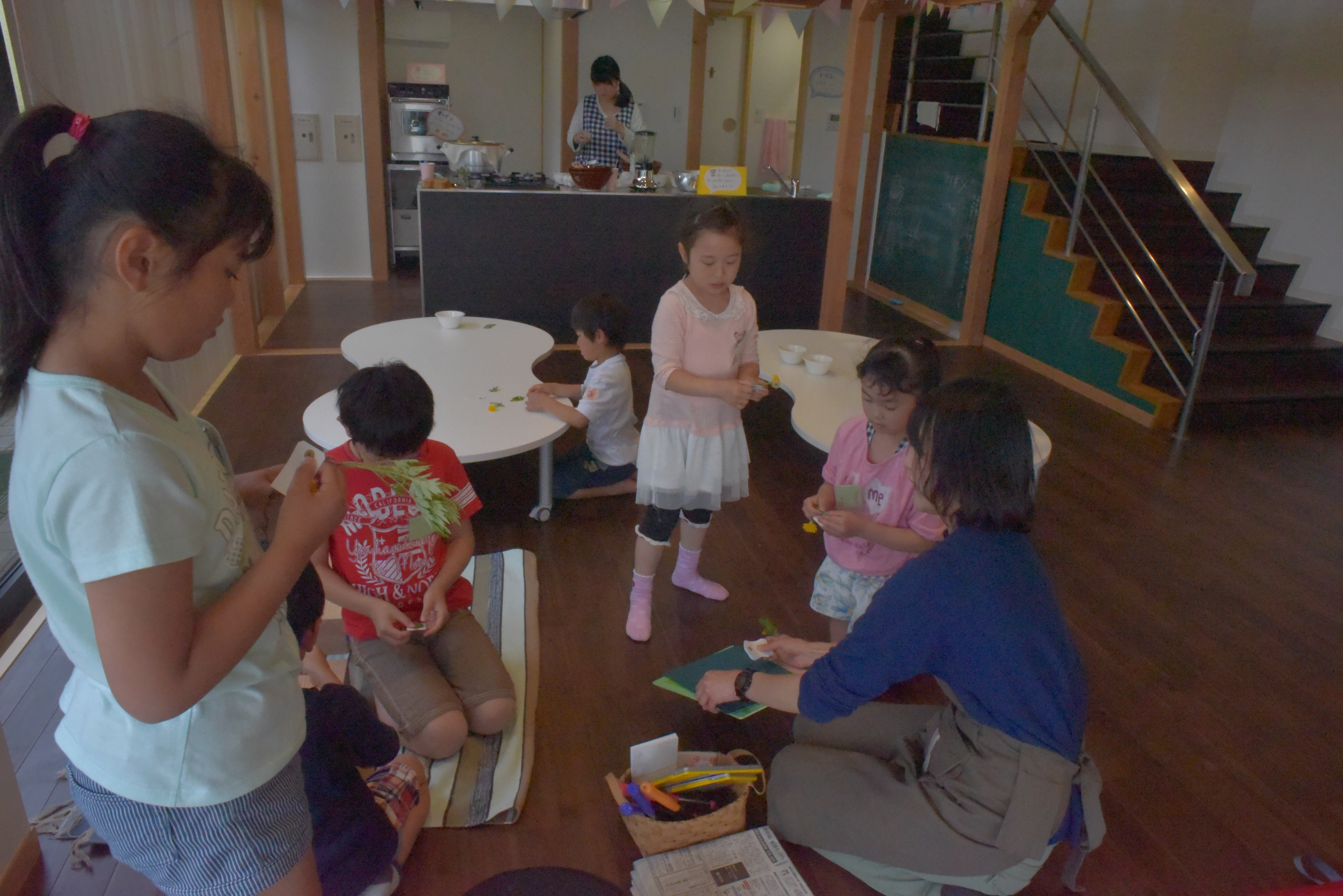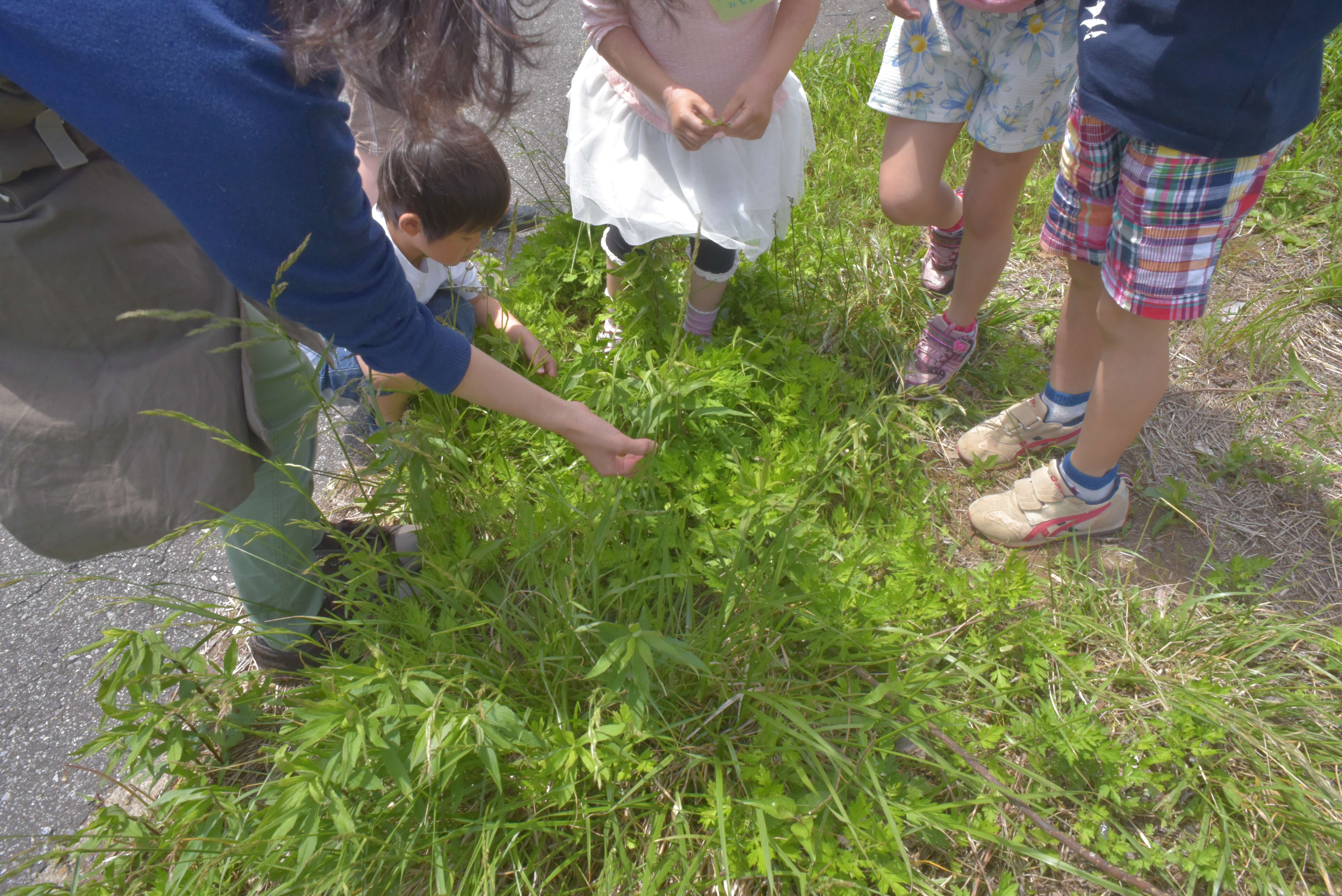 春の植物「ヨモギ」について調べたあとに、実際にどこにヨモギが生えているのか探しに行きました。葉っぱをもんでにおいをかいでみたり、五感を使ってヨモギを感じたら、ヨモギをつかって蒸しパンをつくります。